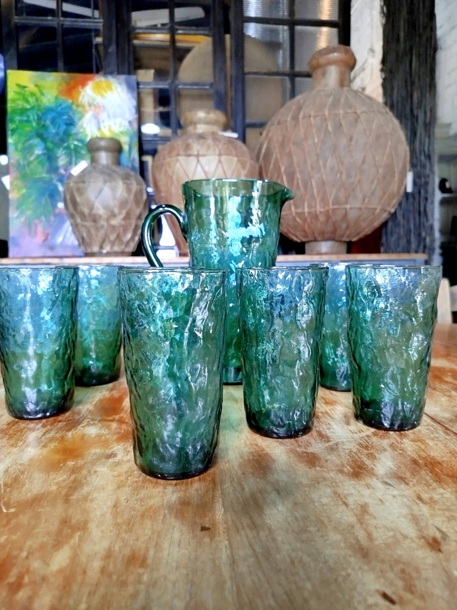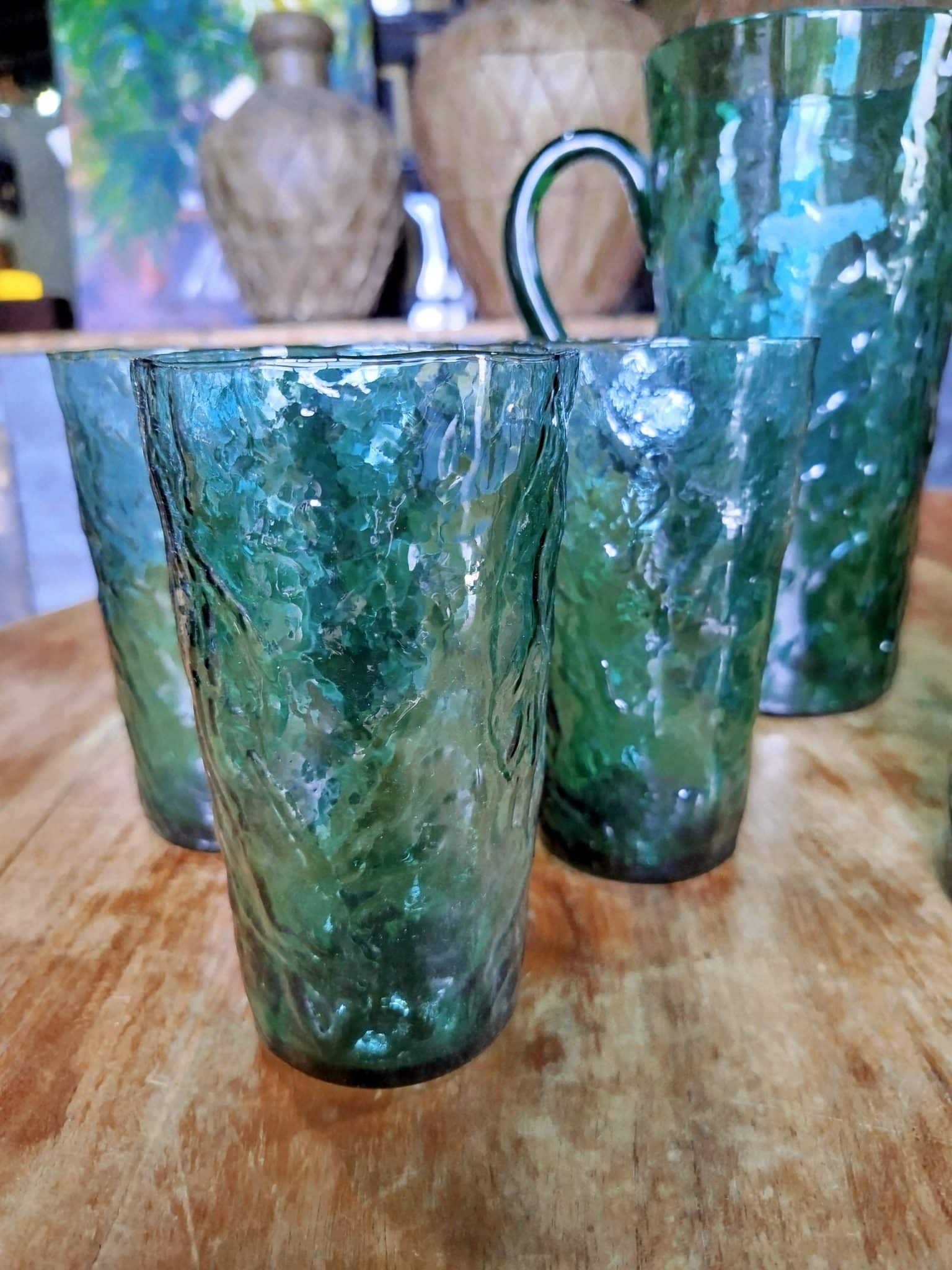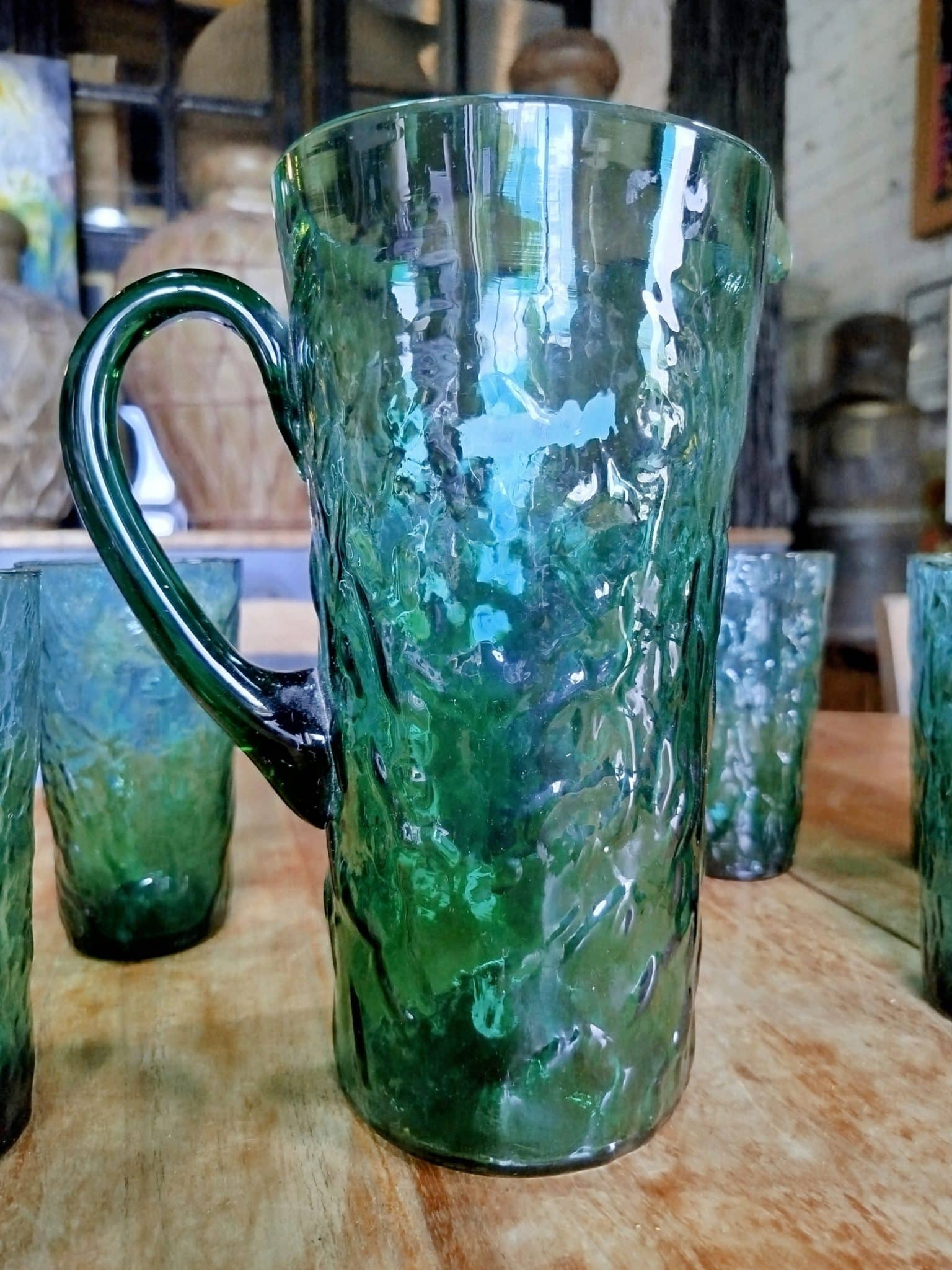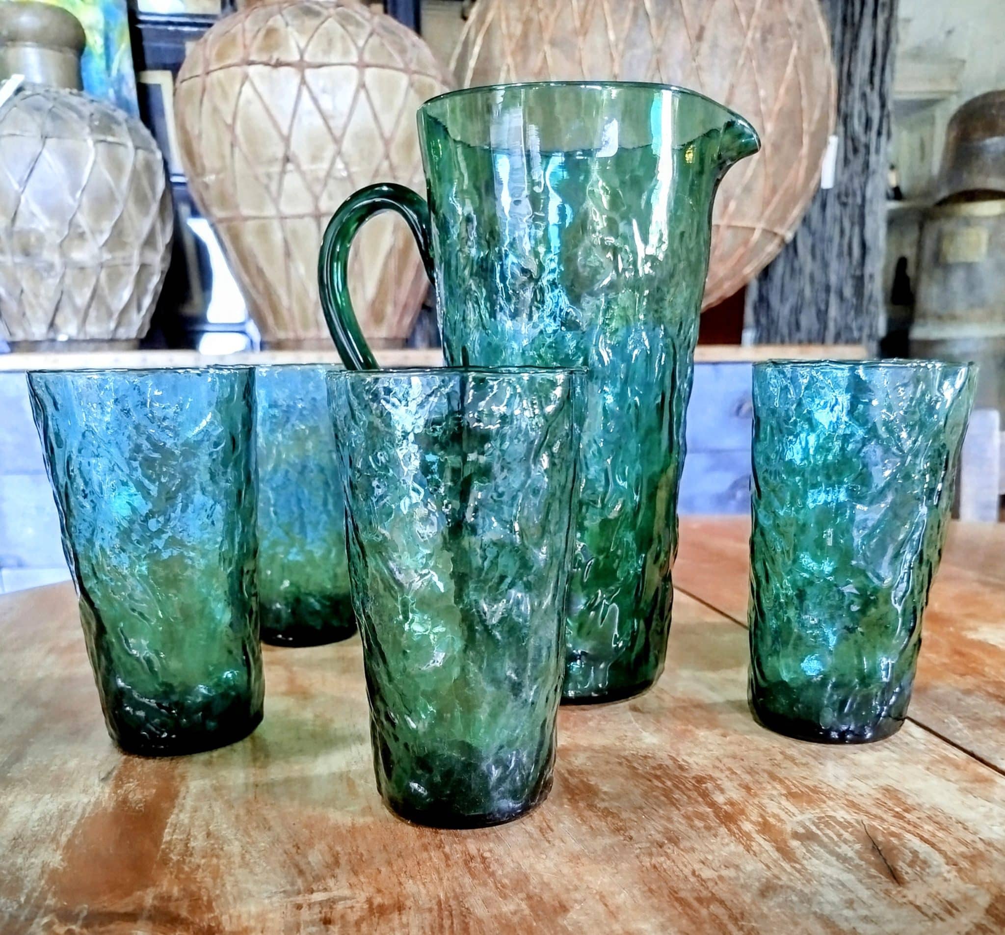 Conjunto jarra y seis vasos de vidrio, en verde esmeralda,en perfecto estado, de mediados de siglo.